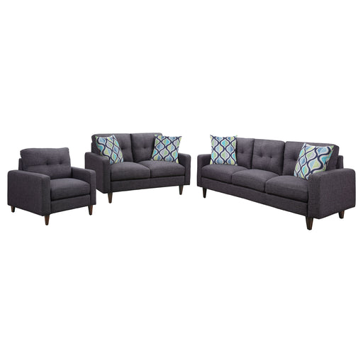 Coaster Z2 StandardThe perfect combination of retro and modern, this three-piece living room set is stunning. This set is structured and elegant with delicate tufting...
