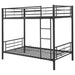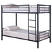This modern metal bunk bed is a smart showpiece for a youth bedroom. It features twin over twin beds, which is perfect for summer sleepovers. Protective guard rails on the top bunk make for safe sleeping while the connective ladder makes for easy access. Fashioned with strong two-inch metal tubing, the bed has crisp, straight lines for a clean stance. It is available in trendy black finish (also available in silver metal finish).