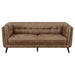 Host guests in your contemporary living room with this mid-century modern shelter style seating set, featuring plush grid tufted backrests and cushions upholstered in a soft brown performance coated microfiber for supreme comfort. This retro-inspired contemporary upholstered living room collection presents classic Chesterfield style frames, accented with wet trim details and flared tapered dark brown wood legs for a chic vintage vibe.