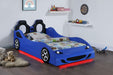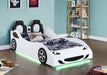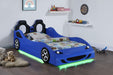 Modern race car aesthetics inform the design of a novelty car bed perfect for kids. Its twin size is versatile, allowing for plenty of space to play within the bedroom. The car is complete with realistic details and features LED strip lighting underneath, creating a fun glow that easily doubles as a nightlight for smaller kids. Curvy sides mimic the lines of a real race car while creating side rails that help keep restless sleepers from slipping out of bed in the night. Black decorative details finish the look, offering realism and whimsy.
