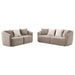 Bring fresh style and sophistication to your living room with a modern two-piece sofa set. An updated shelter silhouette defines each piece, with neutral latte chenille upholstery that adds warmth. Complementary accent pillows add softness to foam cushions, perfect for everything from entertaining to lounging. The sofa and loveseat are a charming pair, each with sloping arms with tailored details and slight recessing that allows seating to stand out. Choose this set for a refined but approachable look in your home.