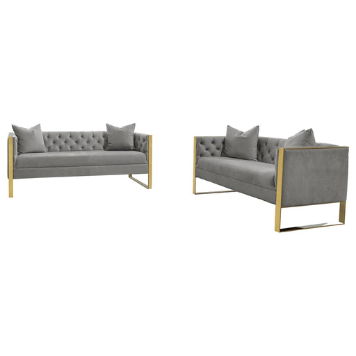 Glamorous and stylish, this sofa and loveseat offers a formal touch of Hollywood Regency to a home. Both seats and wrapped in a light grey velvet u...