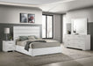 Upgrade your bedroom with this ultra-modern platform bed and matching case pieces. The bed features a sleek white faux leather upholstery with horizontal channel tufting, while its low-profile design enhances the contemporary aesthetic. Case pieces are finished in a polished white high-gloss polyurethane for a clean, sophisticated look. Polished chrome metal bar handles provide a sleek contrast, while spacious drawers with felt-lined top sections offer both style and functionality.