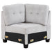 Customize a sectional that suits your space with a modern armless corner chair. In soft beige upholstery, it's the perfect centerpiece for your Georgina collection sectional sofa, creating a turn just where you need it to suit your living room. The corner features tufted cushions, one seat and two back, and sinuous spring decking under the seat, offering impressive comfort and support. Legs are a black finish tapered block style, complementing surrounding decor while offering stability and support. This sectional piece is constructed with Asian hardwoods and plywood for optimal strength and durability.