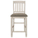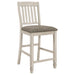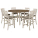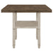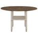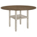 Casual with a transitional style, this five-piece counter height dining set includes a table and four chairs. The dual tone table offers a rustic cream base and is topped with a nutmeg tabletop. Perfect for a modern farmhouse kitchen breakfast nook, this dining table also has four drop leaves that can be raised to support extra dinner guests. In addition, each counter height chair has matching cream wood frame and steam bent curved slats on the backrest, as well as a padded seat cushion with fossil upholstery. For extra storage space, the drop leaf table also has an open lower shelf for storing plates or displaying decor.